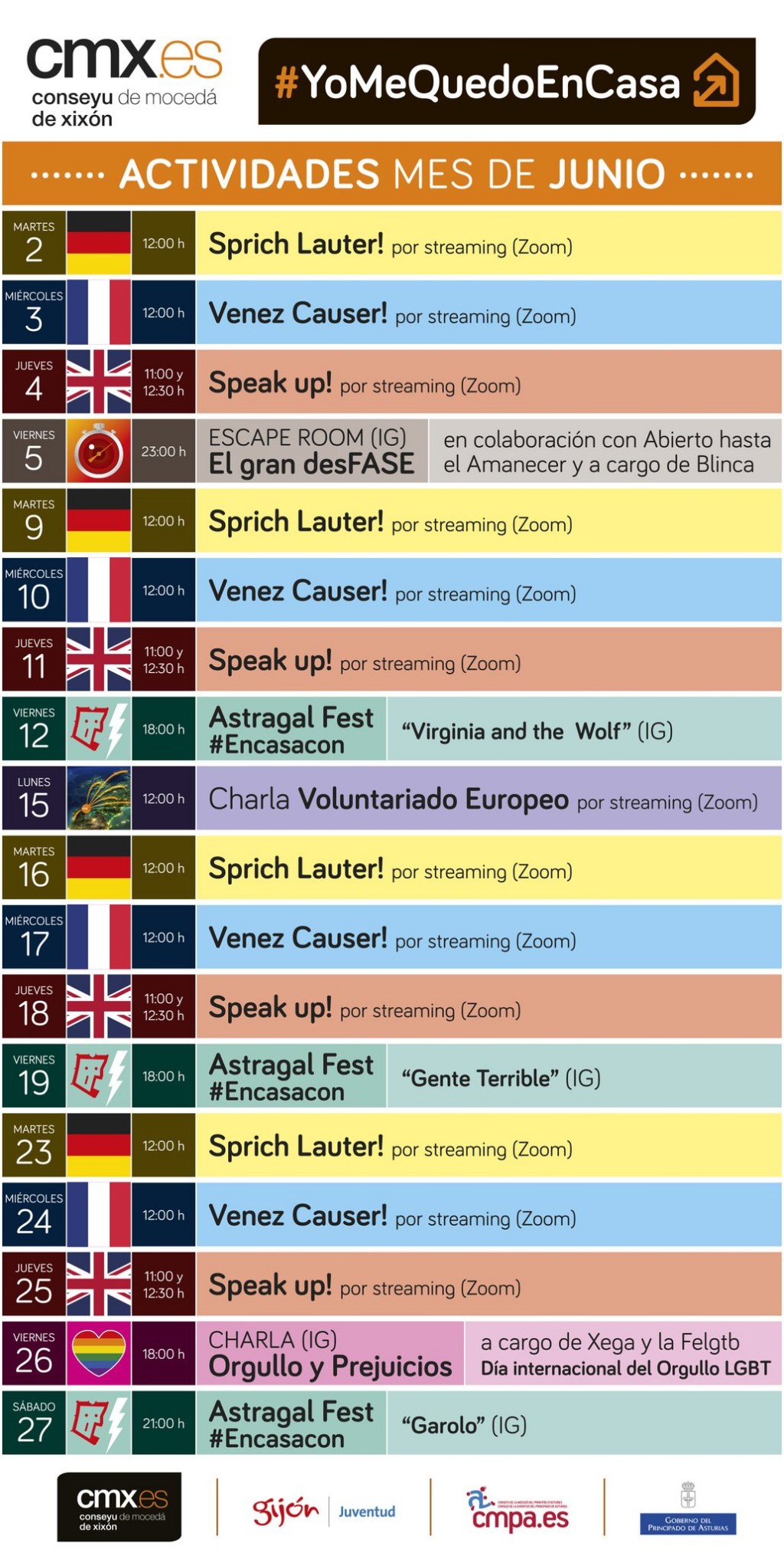El Conseyu de Mocedá de Xixón y el Conseyu de la Mocedá del Principáu d'Asturies continuamos programando, durante el mes de junio, actividades gratuitas online dirigidas a jóvenes, con el objetivo de contribuir a hacer más llevadero el confinamiento a través de 22 propuestas de ocio, cultura, formación, deporte y salud. Para el desarrollo de estas entidades contamos con la colaboración del Departamento de Juventud delAyuntamiento de Gijón/Xixón.
